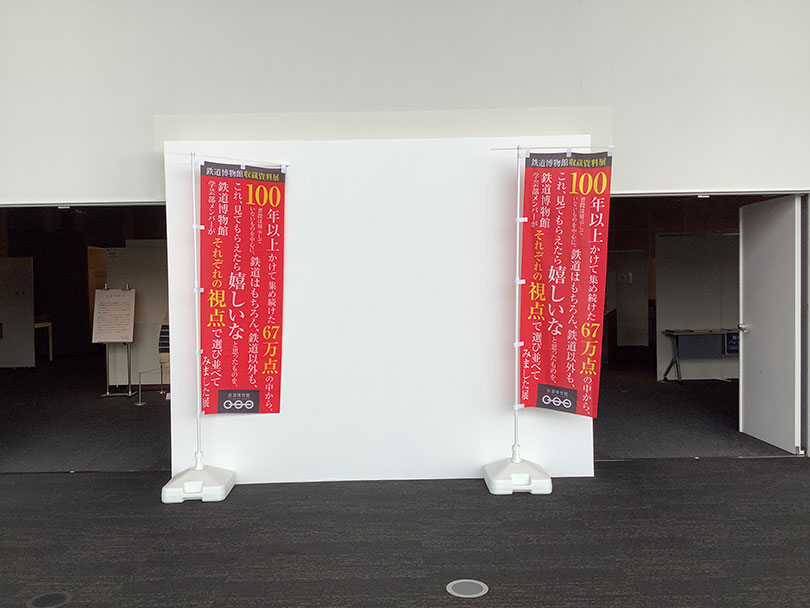 学芸部N:この長いタイトルを活かしてお客さまの目を引くようなものにしたいと考えた時に、のぼりにしたら面白いのではと思い、この形で展示室前を装飾しました。バナーも長いタイトルが活きるように、文字の強調や色味にこだわってデザインを考えました。