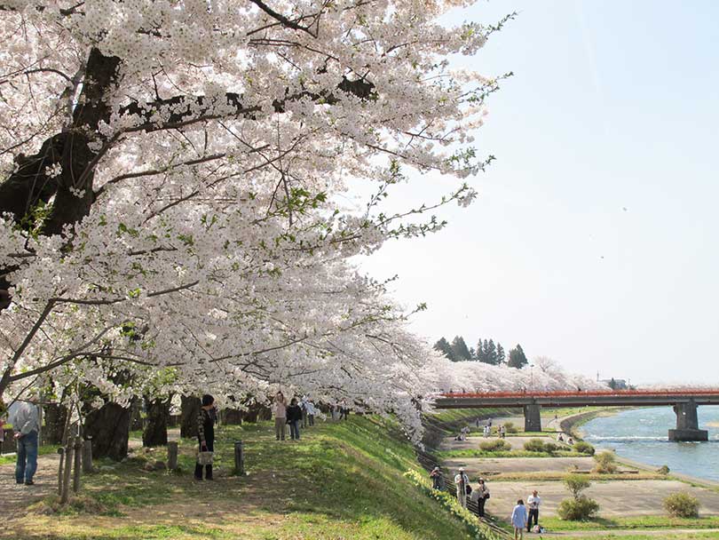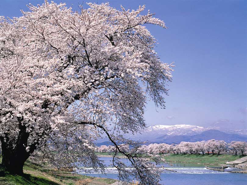 白石川沿いに約8km続く桜並木「白石川堤一目千本桜」は、約1,200本のソメイヨシノが咲き誇る、宮城県を代表する桜名所。〈一目千本〉とは、まるで千本の桜を一目に見渡すような壮観さを表した呼び名で、白石川の澄んだ青さ、蔵王連峰に残る雪の白さと重なり、春の定番の風景となっています。