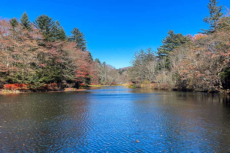 今回立ち寄ったのは、駅から自転車で7分ほどの景勝地「雲場池(くもばいけ)」。徒歩でも約20分前後で行くことができます。春は桜、夏は深緑、秋は紅葉など1年を通して景観が美しく、一周できる散策路も整備されています。湧水「御膳水」が流れ込んでおり、湖面に映る木々の姿や空を映して、写真映えスポットとしても人気があります。