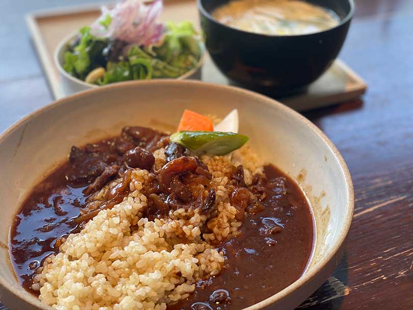 今回いただいたのは、看板料理「酢重のハヤシライス」。長期熟成の信州赤味噌を隠し味に使っており、まろやかなコクがありながらも重たすぎず、旅の途中でもぺろりと食べられる味わいです。窓側の席からは軽井沢の街並みが眺められ、ゆるやかな旅の時間を感じられます。
