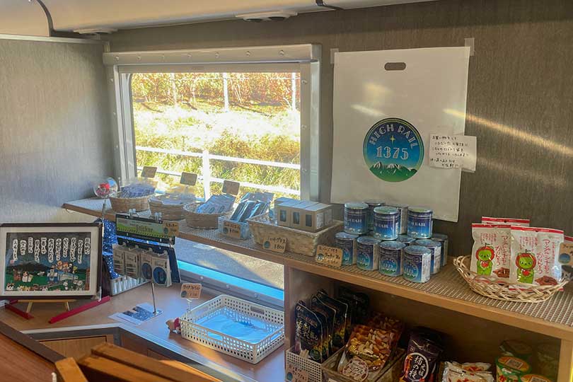 1号車には物販カウンターがあり、ドリンク、軽食、オリジナルグッズなどを購入することができます。なかでも人気は、画家・千住博がパッケージデザインを監修したクラフトビール「星のふる夜に」。まろやかでキレのある味わいで、車窓を眺めながらいただく一杯として最高です。旅の記念には、フタが大きな缶バッチになったオリジナルクッキー缶(800円)もおすすめ。